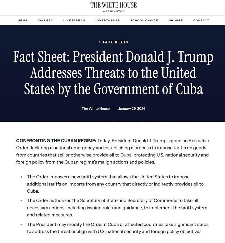 EU.- En un movimiento que remueve las tensiones hemisféricas, el presidente Donald Trump firmó este 29 de enero una orden ejecutiva declarando una emergencia nacional por las “acciones malignas” del régimen cubano, autorizando aranceles adicionales a importaciones de cualquier país que suministre petróleo a la isla. Según el comunicado oficial de la Casa Blanca, esta medida busca cortar el flujo de crudo que sostiene a La Habana, proveniente principalmente de naciones como Venezuela, Rusia y, recientemente, México bajo el gobierno de Claudia Sheinbaum, quien ha defendido envíos soberanos de Pemex a Cuba pese a las advertencias estadounidenses. Fuentes como Reuters y PBS destacan que el decreto no especifica tasas arancelarias inmediatas, pero empodera a los secretarios de Estado y Comercio para implementarlas, con potencial para escalar si Cuba no alinea sus políticas con los intereses de EE.UU.