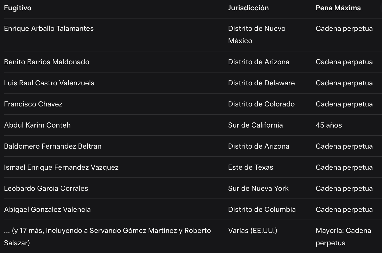 Entre los extraditados destacan figuras como Abigael González Valencia, líder de "Los Cuinis" y cuñado de "El Mencho", extraditado al Distrito de Columbia con posible cadena perpetua por tráfico de drogas y violencia extrema; Servando Gómez Martínez, alias "La Tuta", exjefe de los Caballeros Templarios, enviado al Sur de Nueva York por cargos similares; y Roberto Salazar, acusado del asesinato de un alguacil en Los Ángeles en 2008. La mayoría enfrenta juicios en distritos como Arizona, Texas y Nueva York, con penas máximas de hasta cadena perpetua por narcotráfico, lavado y homicidio.